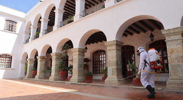 Equipadas con bombas de aspersión y soluciones a base de agua y alcohol, cuadrillas adscritas a la Coordinación Ejecutiva del Centro Histórico intervinieron todas las áreas del Palacio Municipal, incluyendo las oficinas de la Presidencia, Regidurías, instalaciones de las diferentes direcciones, cajas recaudadoras, baños, patios y pasillos, así como los salones Ex Presidentes y Porfirio Díaz Mori, este último es donde se realizan las Sesiones de Cabildo.