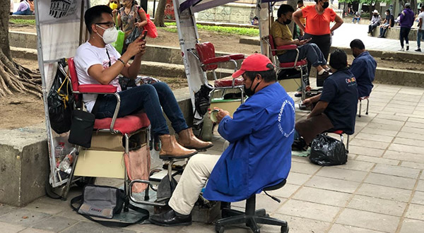 Oaxaca de Juárez, Oaxaca, 6 de agosto de 2021.- Como resultado del reordenamiento del comercio informal que emprende el Ayuntamiento de Oaxaca de Juárez, aseadores de calzado retornan de manera escalonada al primer cuadro de la ciudad luego de concluir de manera voluntaria ante la Dirección de Gobierno el proceso de revisión y validación de documentos y tras el pago de impuestos y derechos municipales.