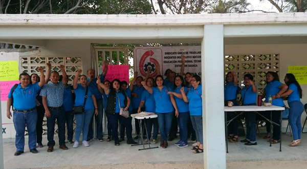 SALINA CRUZ, OAX. Docentes del Conalep plantel 155 adheridos al Sindicato Único de Trabajadores del Colegio Nacional de Educación Profesional Técnica del Estado de Oaxaca (SUTDCEO) se manifestaron frente al plantel por las múltiples violaciones al Contrato Colectivo de Trabajo.