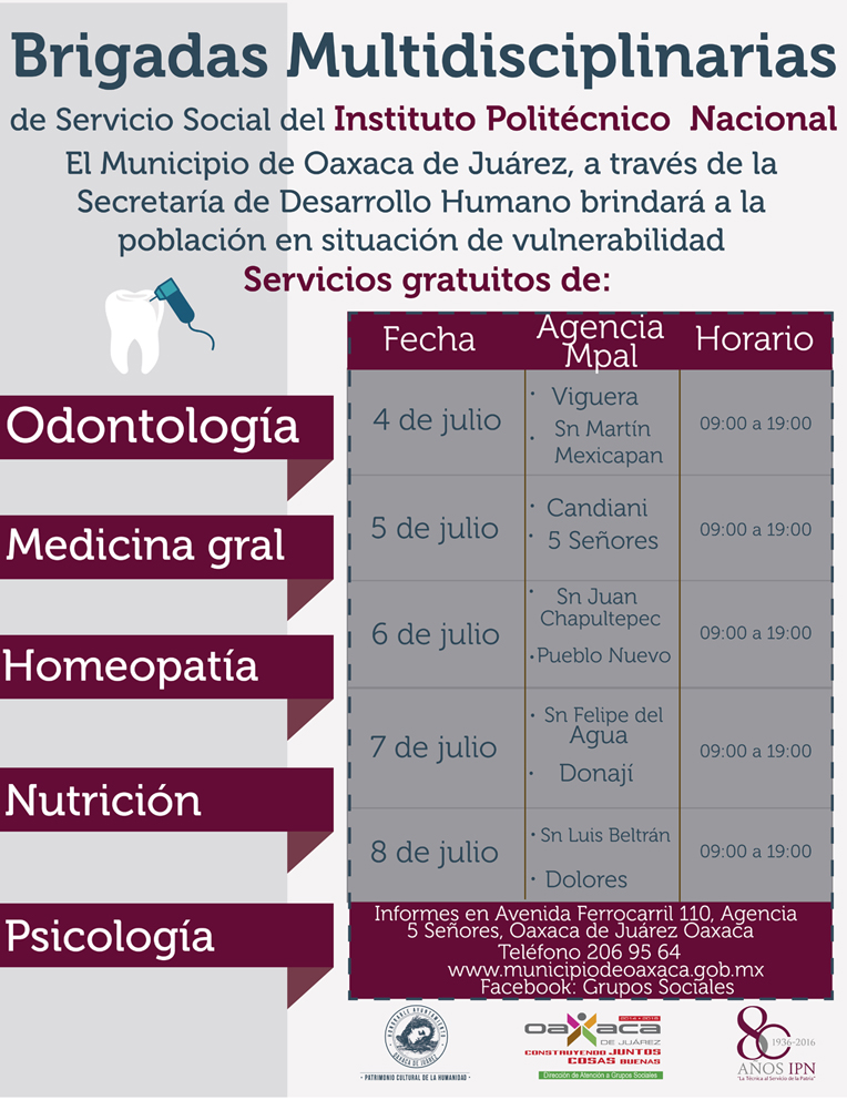 El Municipio de Oaxaca de Juárez, a través de la Secretaría de Desarrollo Humano y el Instituto Politécnico Nacional (IPN) siguen brindando servicios médicos gratuitos en las Brigadas Multidisciplinarias de Servicio Social Comunitario, que en los próximos días estarán en más de ocho agencias municipales.