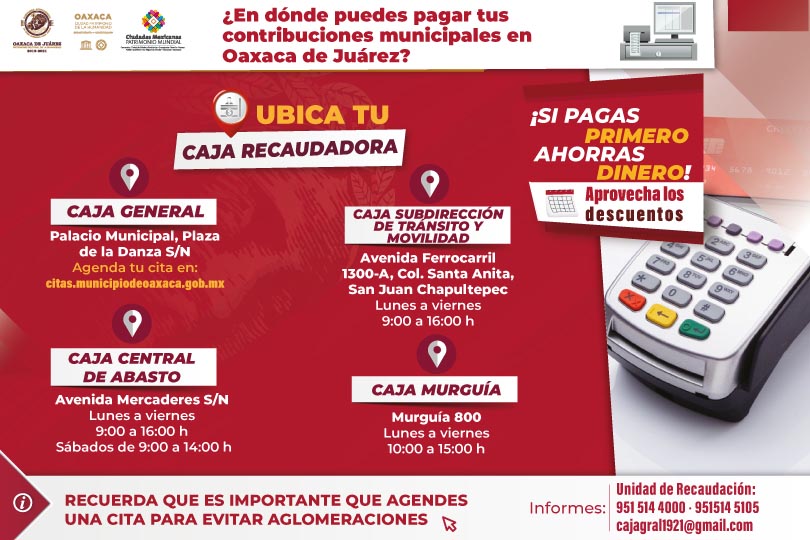 Para evitar la aglomeración de personas, la ciudadanía puede solicitar mayores informes en los números telefónicos de la Tesorería Municipal: 951 514 4000 y 951 514 5105.