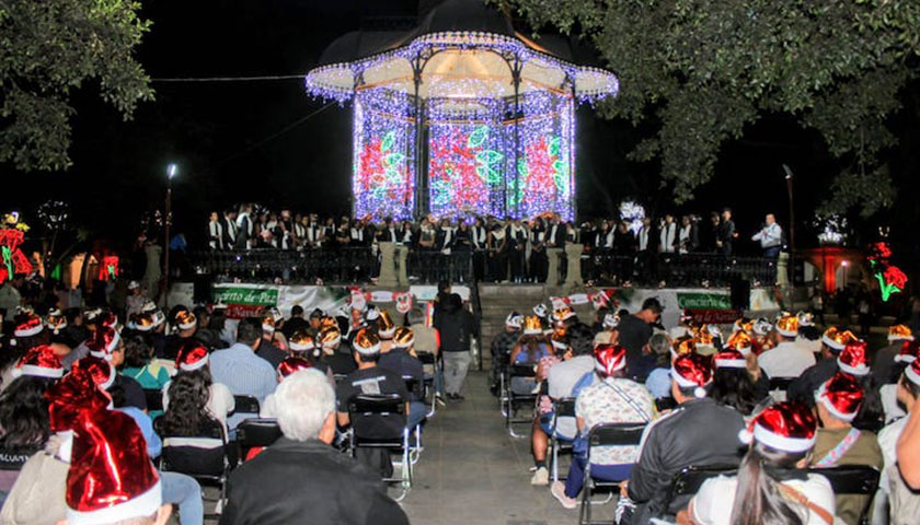 El Quiosco iluminado de la capital oaxaqueña fue el escenario para que el Coro de la institución universitaria, bajo la dirección del maestro Abdías Cruz López, interpretara diversas melodías como Veni, Veni Emmanuel, Cantique de Noël y We Three Kings, entre otras.