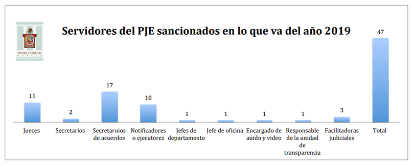 Asimismo, se han sancionado a: 11 jueces; 2 secretarios; 17 secretarios de acuerdos; 10 notificadores o ejecutores; 1 jefe de departamento; 1 jefe de oficina; 1 encargado de audio y video; 1 responsable de la unidad de transparencia y 3 facilitadoras judiciales.