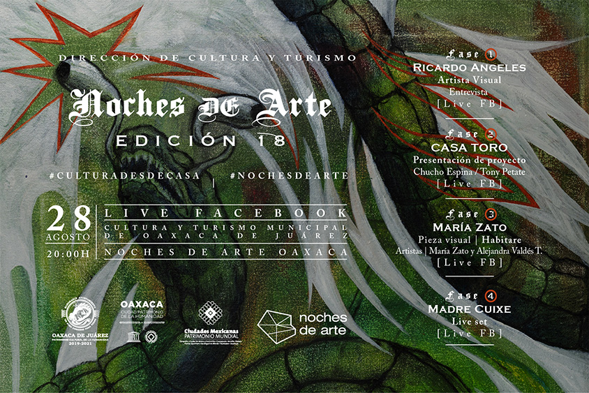 Oaxaca de Juárez, Oaxaca, a 24 de agosto de 2020.- Para continuar promoviendo la amplia oferta cultural que se conjuga en la ciudad capital, el Ayuntamiento de Oaxaca de Juárez, a través de la Dirección de Cultura y Turismo, invita a la edición número 18 de “Noches de Arte”, que se llevará a cabo el próximo 28 de agosto y que podrá apreciarse a través de www.facebook.com/CulturayTurismoOaxaca.
