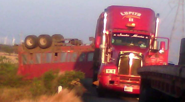 Salina Cruz, Oax. Protección Civil delegación Istmo reportó otra volcadura en el tramo carretero la Ventosa – Tapanatepec.