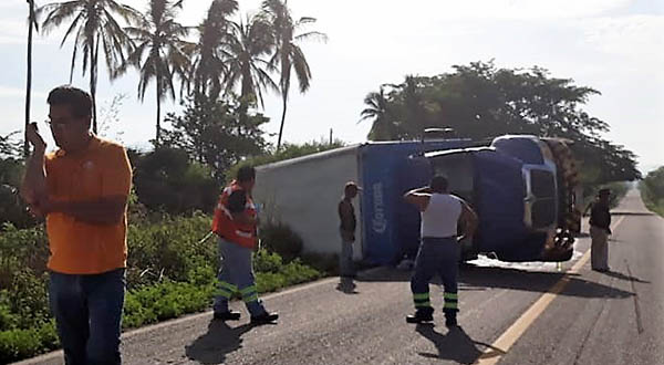 TEHUANTEPEC. Tres empleados de una empresa cervecera que se disponían a entregar la mercancía en Jalapa del Marqués sufrieron una aparatosa volcadura.